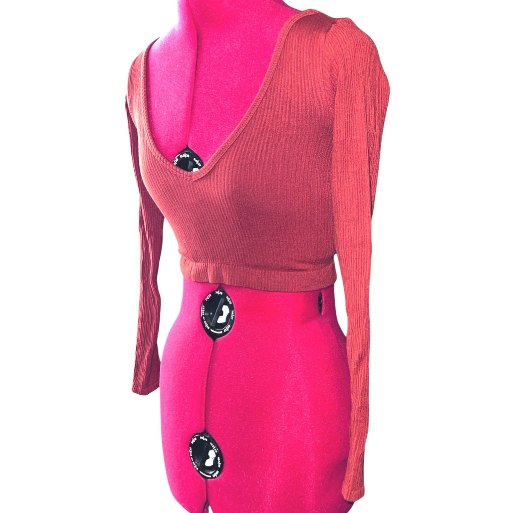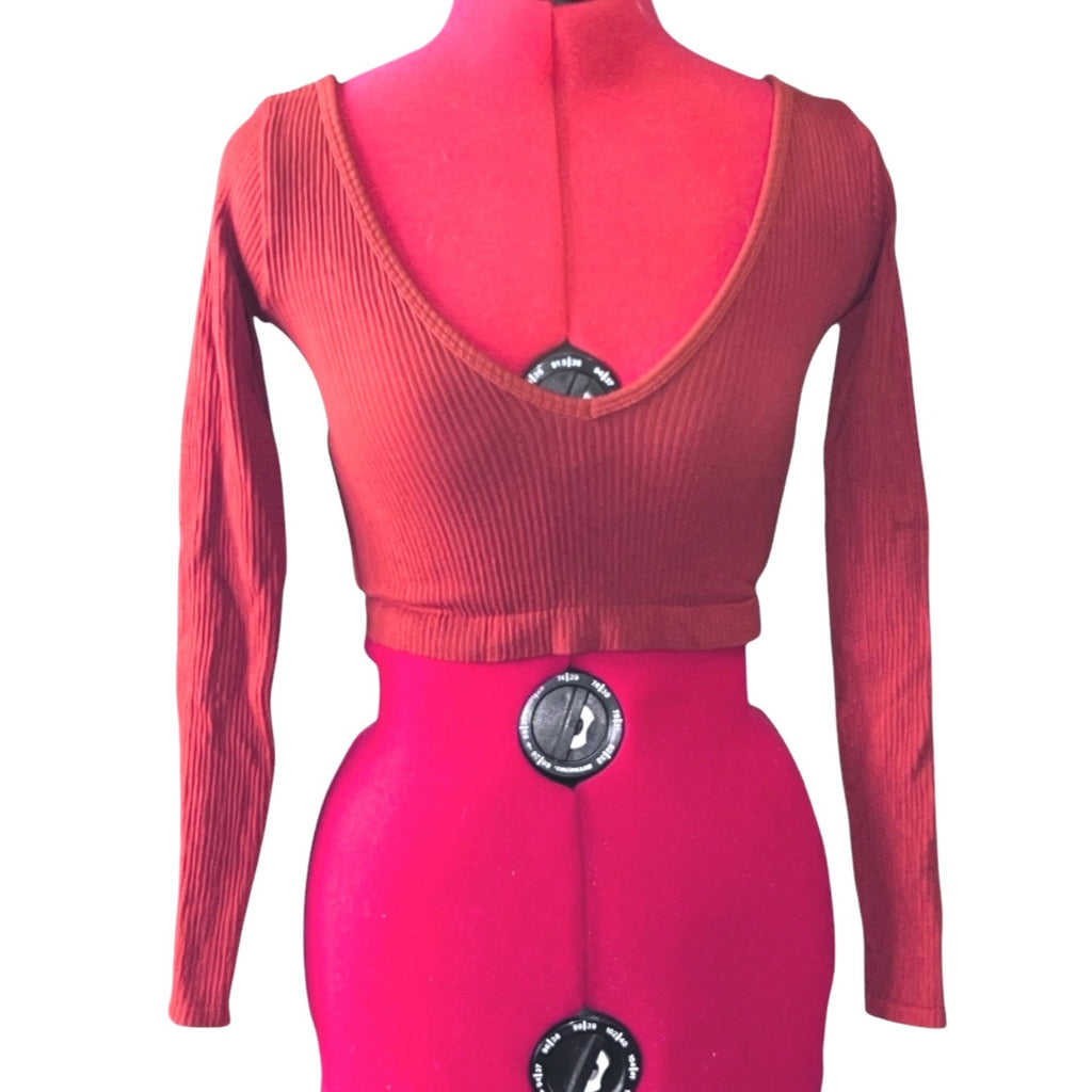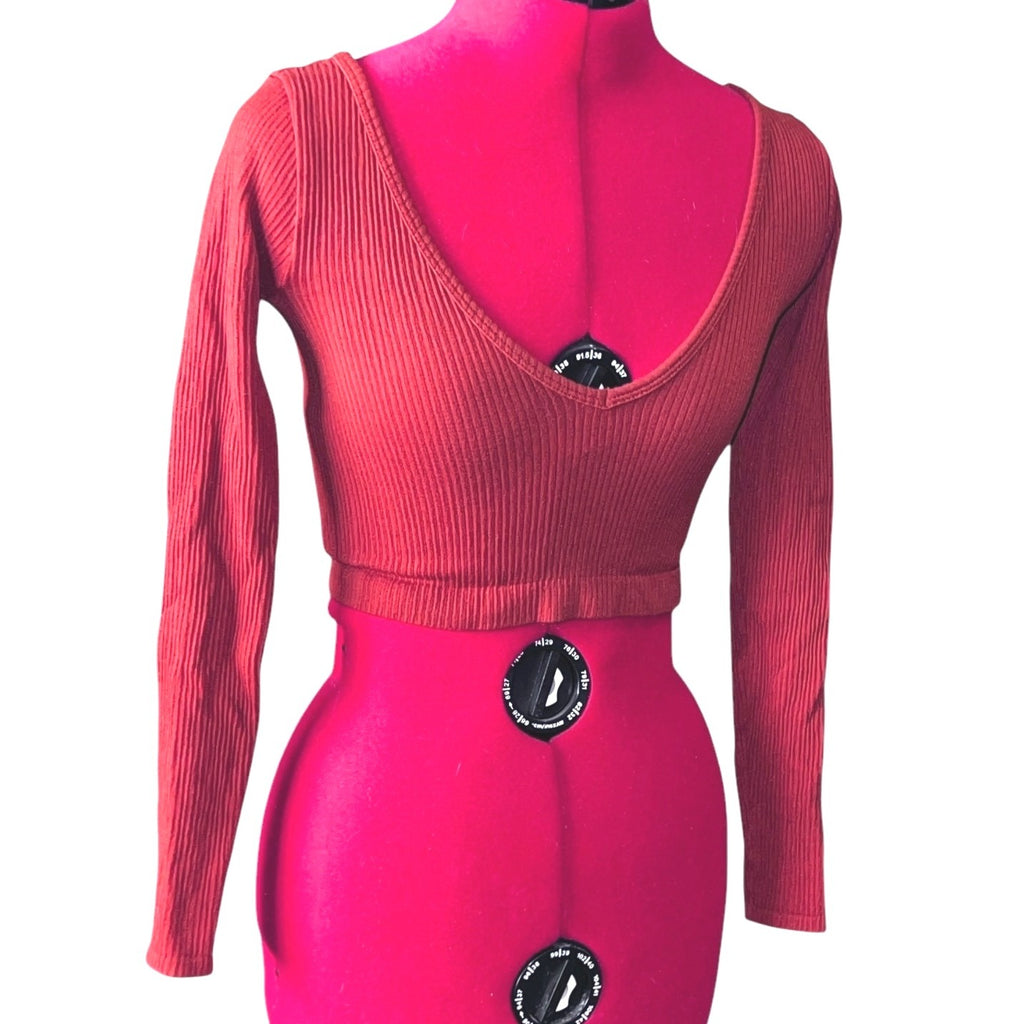 aerie Out From Under Textured Long Sleeve Cropped V Neck Shirt Sz Small Orange Womens