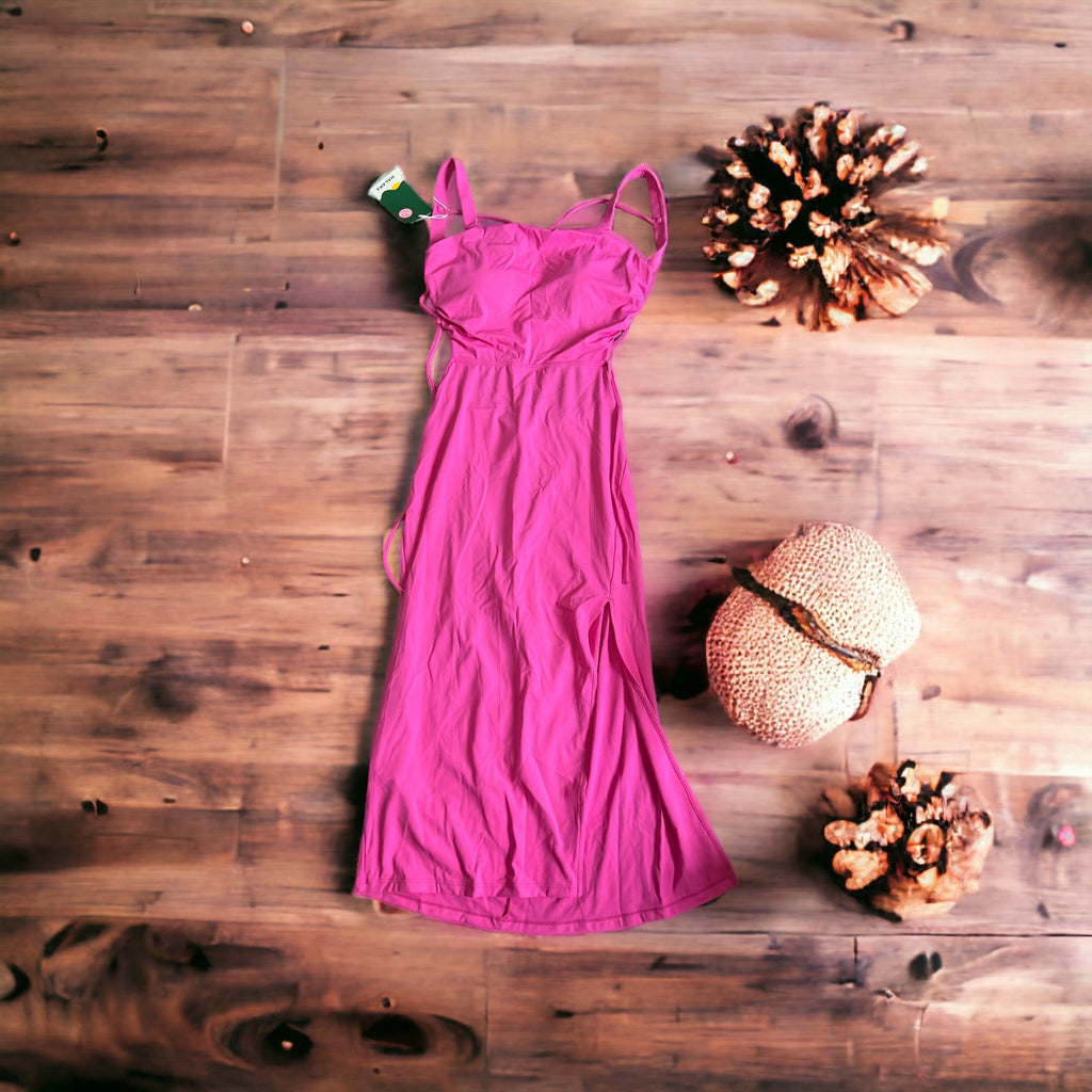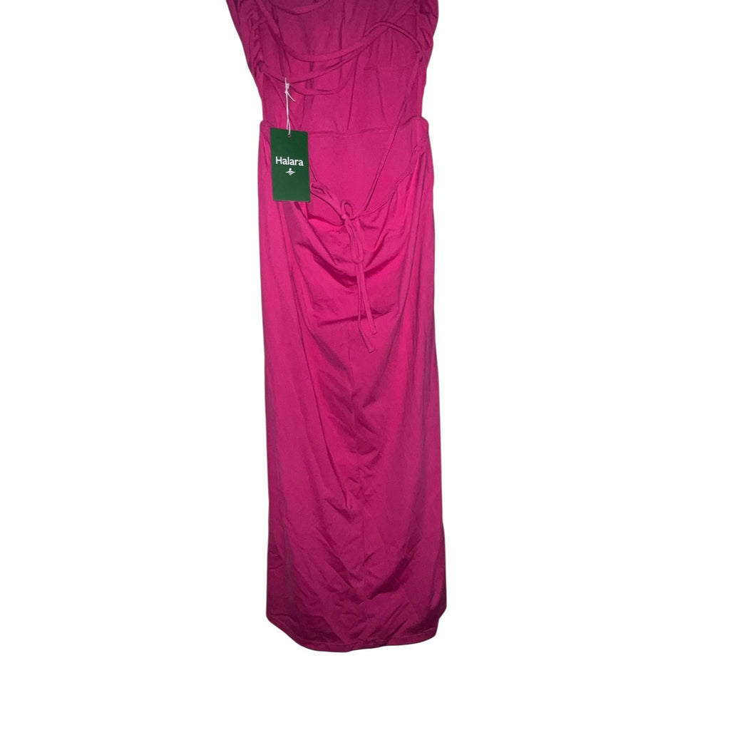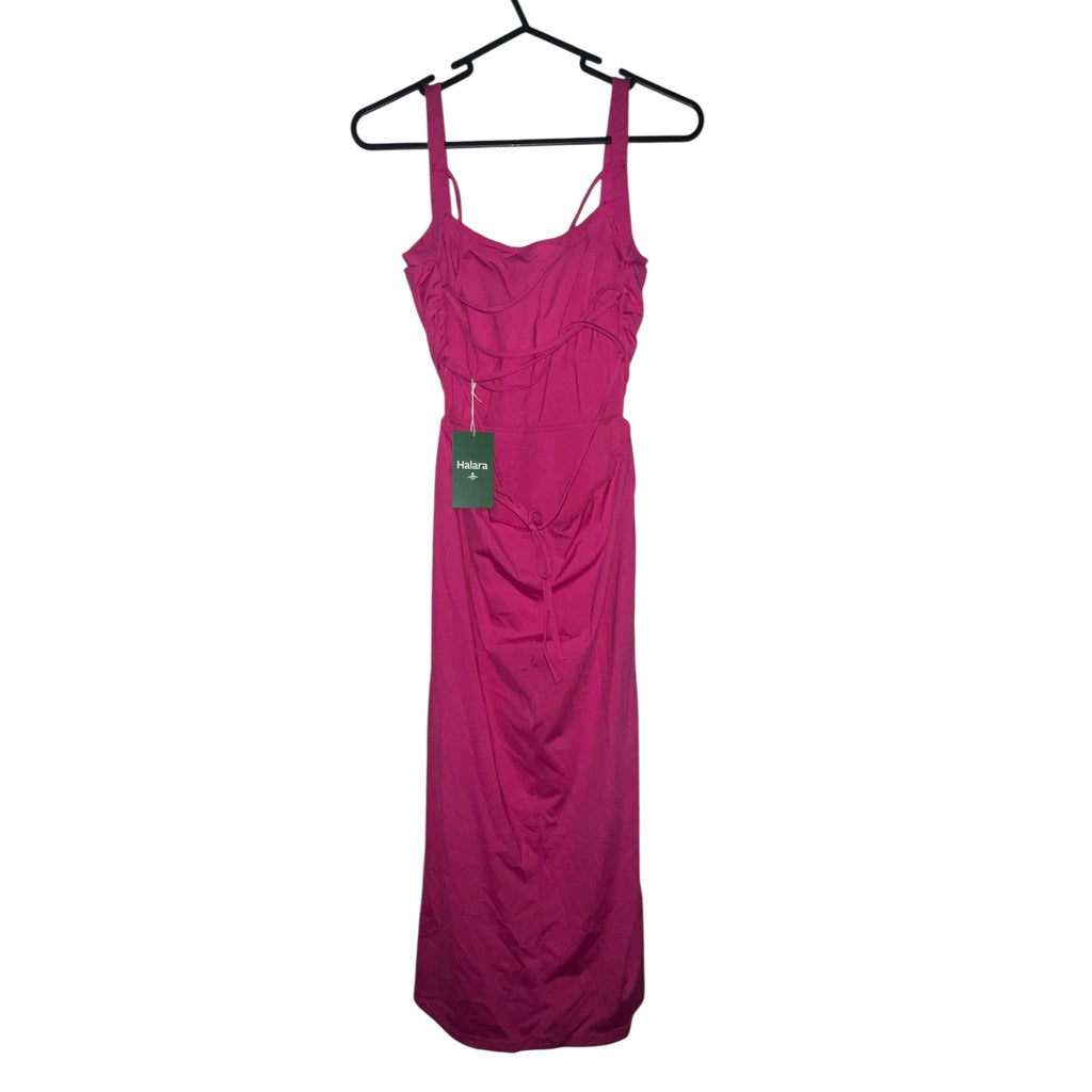 Halara Ruched Backless Crisscross Midi Dress Sz Medium Womens Pink Lace Up Split Bodycon