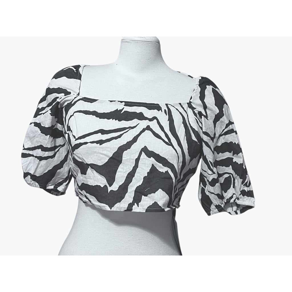 This is a Halara Square Neck Puff Sleeve Backless Tie Back Zebra Stripe Print Crop Top Cotton Blouse