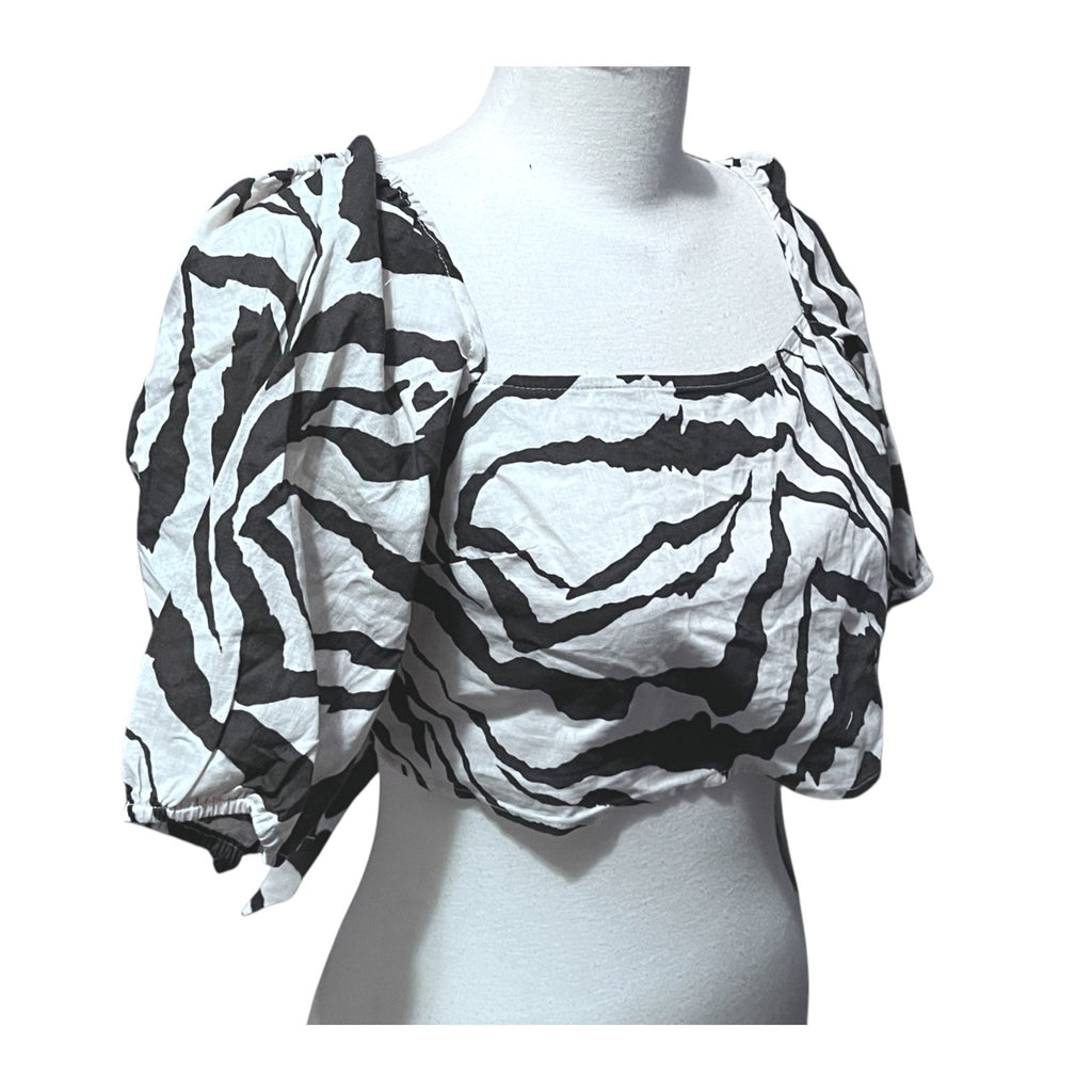 Halara Square Neck Puff Sleeve Backless Tie Back Zebra Stripe Print Crop Top Sz Medium Cotton Blouse