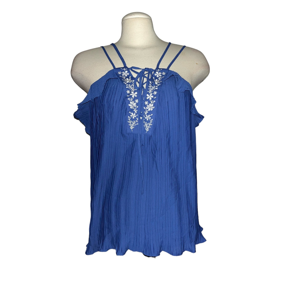 Takara NWT Blue Strappy Boho Embroidered Floral Tank Top Sz Large Womens Ruffle Top